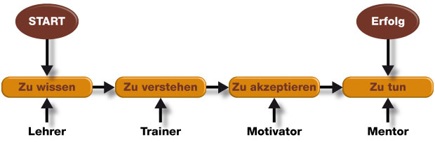 Beim Gebrauch der sechs Hebel ist es notwendig, sich zu erinnern, welche Schritte jeder Mitarbeiter bei einer Verhaltensänderung durchlaufen muss und wie Vorgesetzte bei jedem Schritt behilflich sein können: